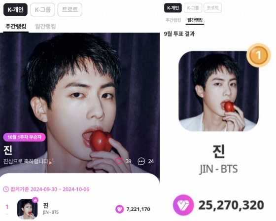 진은 마이원픽 'K-POP 개인부문 주간랭킹' 10월 1주차(9월 30일~10월 6일) 투표에서 722만 1170개의 하트를 얻어 압도적인 표수로 1위에 올랐다.