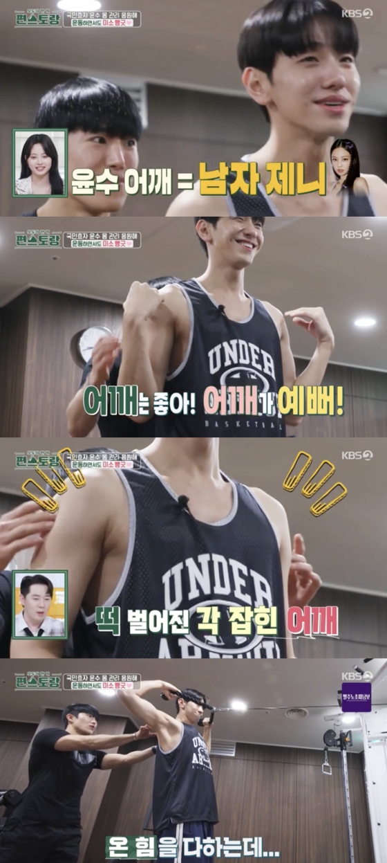 부친에게 신장 이식 수술을 한 남윤수는 몸 관리를 위해 헬스장에 출석했다. 아이돌 출신 트레이너는 남윤수의 근육을 체크하며 "확실히 너가 어깨는 좋아. 어깨가 예뻐. 남자 제니야"라고 남윤수의 떡 벌어진 각 잡힌 어깨를 칭찬했다.