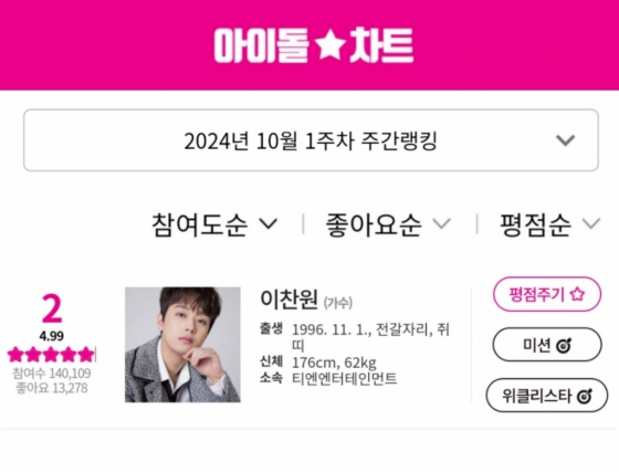 이찬원은 10월 1주 차 아이돌차트 평점랭킹에서 14만 109표를 획득, 전체 2위를 차지했다.