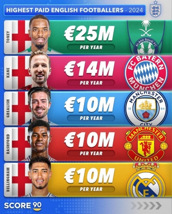 2위는 잉글랜드 대표팀의 간판 공격수이자 '김민재 동료' 해리 케인(바이에른 뮌헨)이었다. 케인은 연봉 은 1400만 유로(약 206억 원)다. 그 뒤를 이어 잭 그릴리시(맨체스터 시티), 마커스 래시포드(맨체스터 유나이티드), 주드 벨링엄(레알 마드리드)가 연봉 1000만 유로(약 147억 원)로 공동 3위를 기록했다.