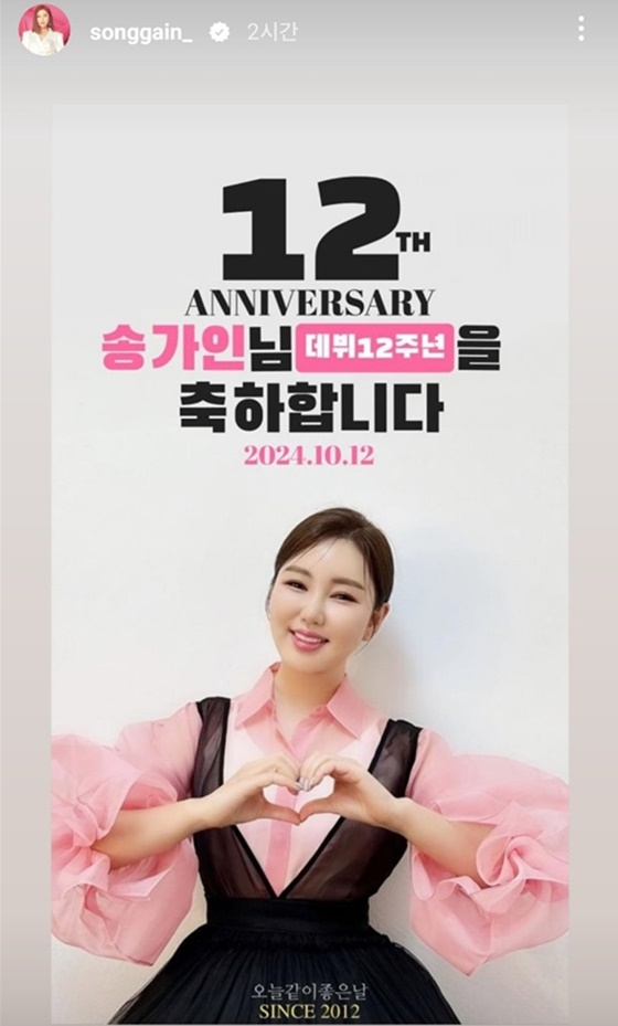 송가인은 12일 공식 SNS 채널을 통해 데뷔 12주년을 맞아 사진을 업로드하며 뜨거운 축하를 받았다.