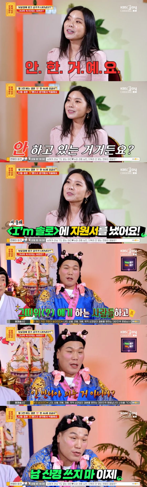 14일 방송된 KBS Joy 예능 프로그램 '무엇이든 물어보살'에는 결혼을 못 한 게 아니라 안 한 거라고 주장하는 46세 여성이 출연했다.