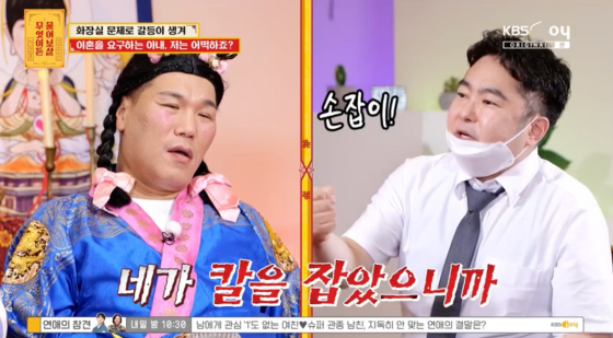 그러자 이수근과 서장훈은 "네가 칼을 잡았으니까 아내가 칼로 자기를 위협했다고 느낀 것"이라며 "아무리 열이 받아도 칼을 들면 안 되는 거다"고 목소리를 높였다.