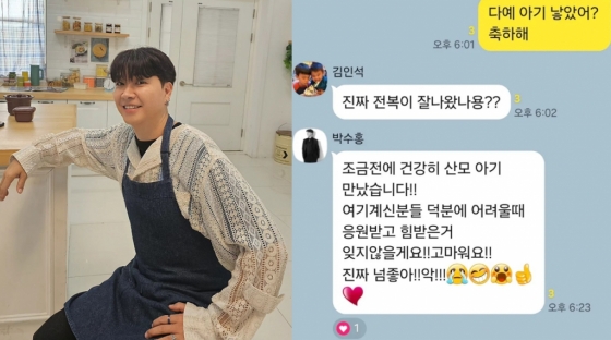 이에 박수홍은 "조금 전에 건강히 산모와 아기를 만났습니다. 여기 계신 분들 덕분에 어려울 때 응원 받고 힘 받은 거 잊지 않을게요. 고마워요. 진짜 너무 좋아 악!"이라고 답했다.