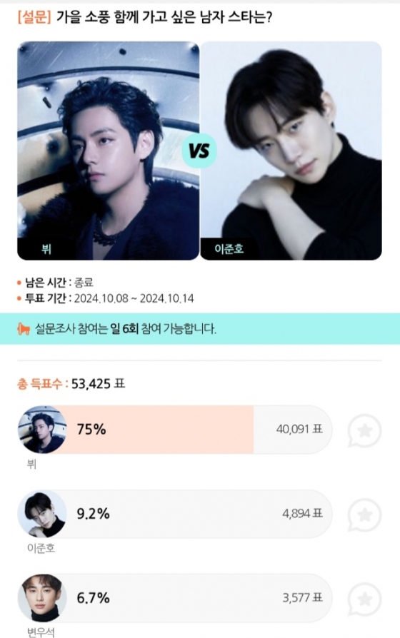 이번 투표에서 뷔는 4만 91표를 얻고 압도적인 득표수를 보였다. 뒤이어 2위는 이준호(4,894표), 3위는 변우석(3,577표), 4위 지민(1,267표), 5위 임영웅(1,219표) 등이 이름을 올렸다.