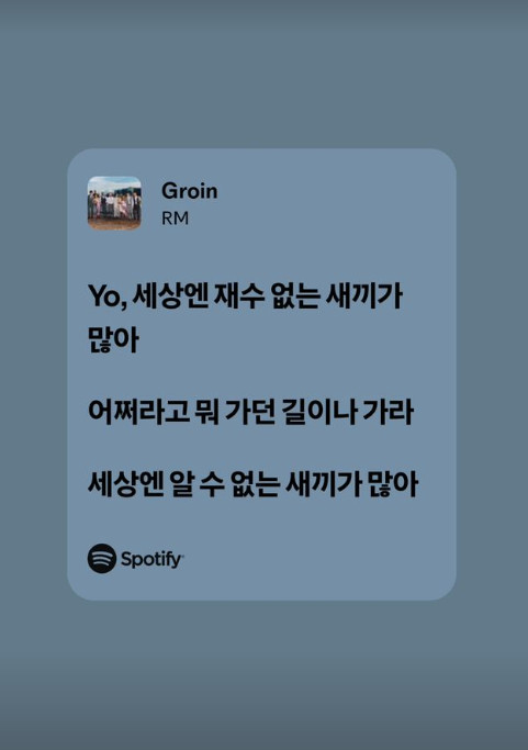 RM은 지난 14일 자신의 인스타그램 스토리를 통해 솔로곡 '그로인'(Groin) 가사의 한 대목을 공유했다.