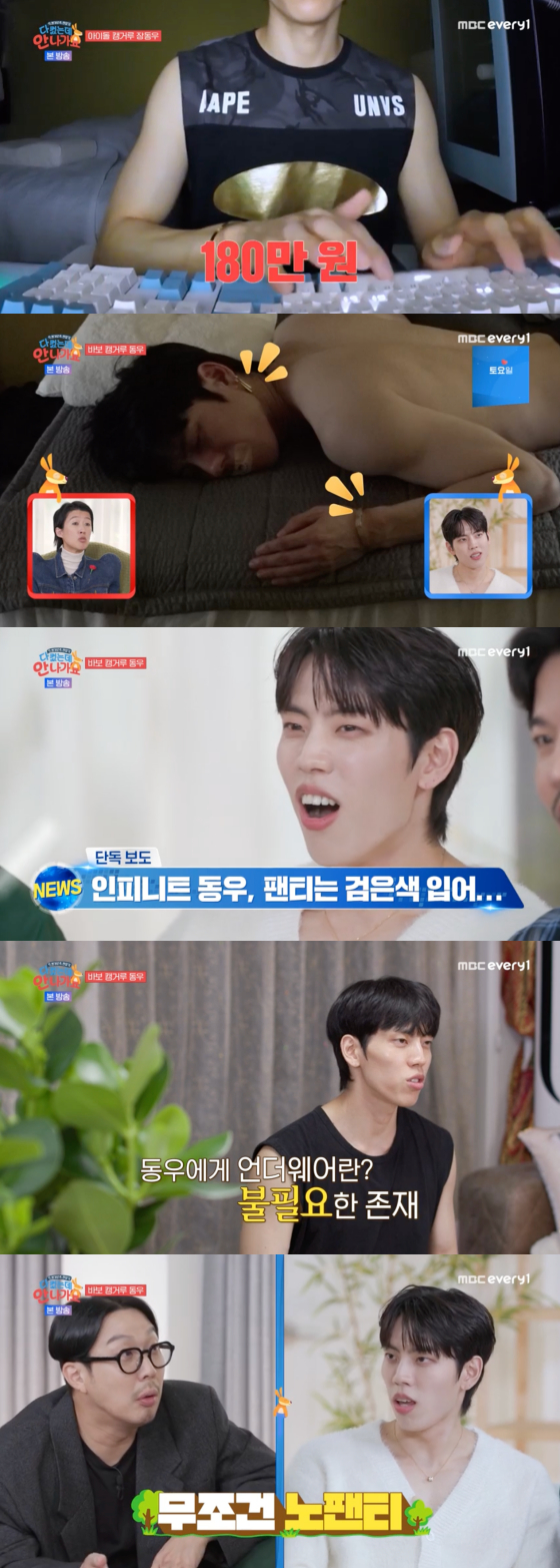 이내 공개된 장동우의 일상에서 그는 속옷만 입은 채 침대에서 일어났다. 이에 대해 장동우는 "잘 때 뭘 걸치는 걸 안 좋아한다"고 말했다.