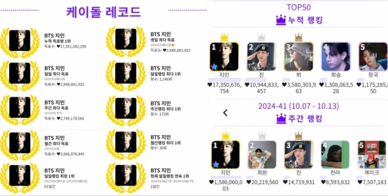 지민은 지난 13일 마감된 케이돌 주간랭킹(2024년 10월 7일 ~ 10월 13일)에서 15억 8606만 3개의 하트를 받아 1위에 올랐다.