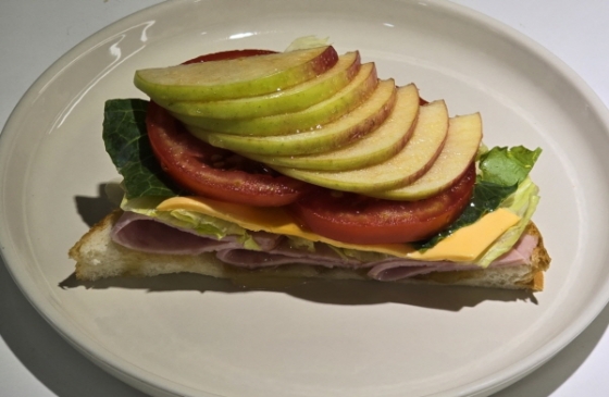 3. 식빵 위에 햄, 양상추, 치즈, 토마토, 사과 순으로 얹으면 샌드위치 완성.