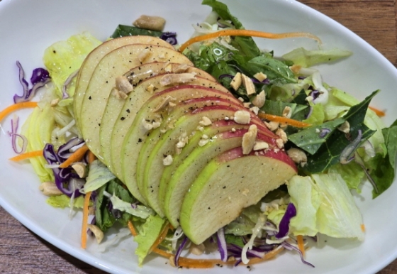 6. 접시에 샐러드용 야채를 깔고 사과를 먼저 얹은 후, 그 위에 견과류를 올리고 소스를 뿌려주면 샐러드 완성.