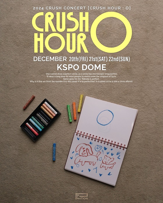 소속사 피네이션(P NATION)에 따르면 크러쉬는 오는 12월 20일부터 22일까지 3일간 서울 송파구 KSPO DOME(올림픽공원 체조경기장)에서 '2024 크러쉬 콘서트 '크러쉬 아워 : 오'(2024 CRUSH CONCERT 'CRUSH HOUR : O')'를 개최한다.