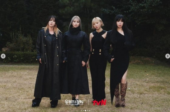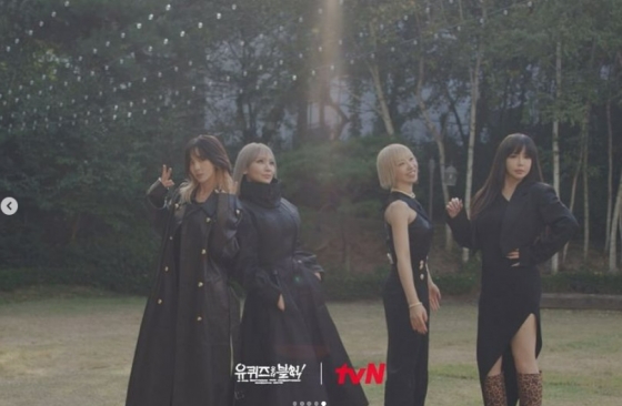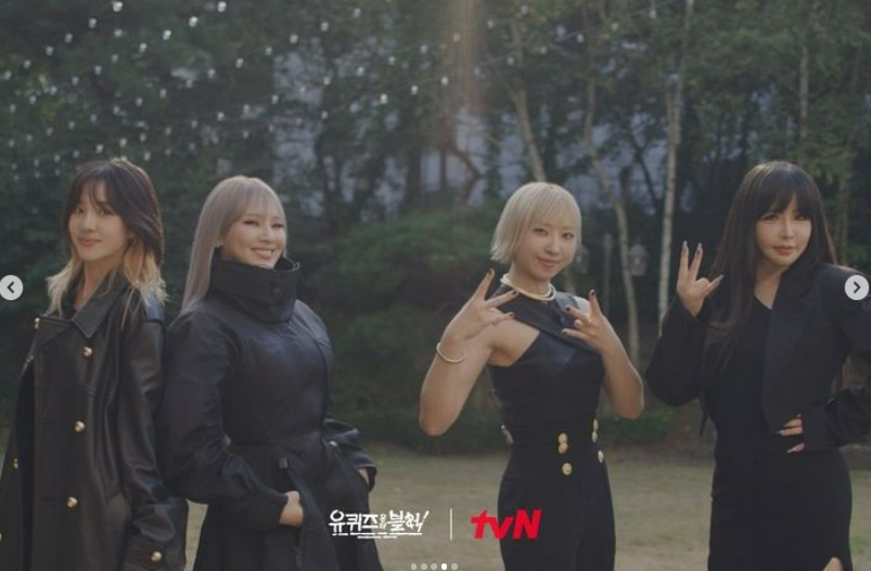 공개된 사진에는 2NE1 완전체 멤버 박봄, 산다라박, CL, 공민지가 '유퀴즈' 등장신을 촬영하는 모습이 있었다. 네 멤버는 올블랙 의상을 맞춰입고 카리스마를 뽐내는가 하면, 해맑게 웃으며 화기애애한 분위기를 자랑했다.