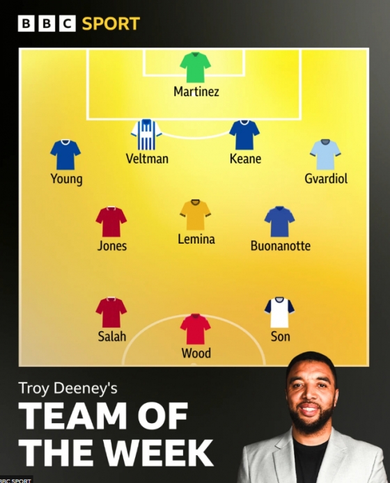 디니는 공격진에 손흥민 포하 크리스 우드(노팅엄 포레스트), 모하메드 살라(리버풀)를 선정했다. 파쿤도 부아노테(브라이튼 앤 호브 알비온, 라미오 르미나(울버햄튼 원더러스), 커티스 존스(리버풀)가 미드필더 3인으로 꼽혔다.