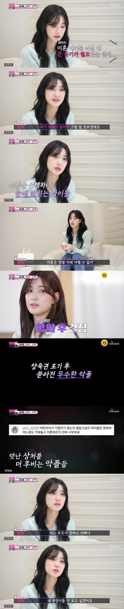 그는 "아이들 문제가 너무 고민됐다. 키우냐, 안 키우냐 그런 문제가 아니라 정말 이 아이들이 받을 상처. 왜냐하면 이혼은 정말 어쩔 수 없이 선택하는 거니까"라고 엄마의 마음을 드러냈다.