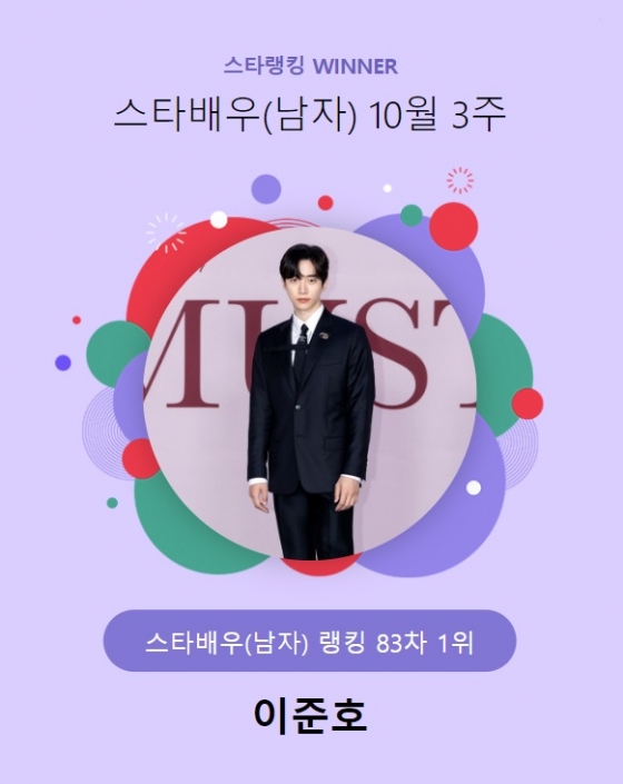이준호는 지난 17일 오후 3시 1분부터 24일 오후 3시까지 진행된 10월 3주(83차) 스타랭킹 스타배우 남자 랭킹 투표에서 2만 9184표를 차지하며 1위 자리에 올랐다.