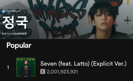 지난해 7월 정국이 발매한 솔로 싱글 'Seven'은 최근 스포티파이에서 20억 스트리밍(필터링 전)을 넘어섰다. 'Seven'은 발매 467일 만에 누적 스트리밍 20억 192만 3921회를 달성했다.