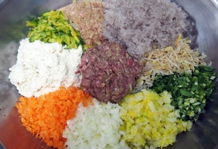 4. 준비한 재료를 볼에 넣어 다진 마늘과 파를 넣고 소금으로 간을 해 잘 버무려 만두소를 만든다.