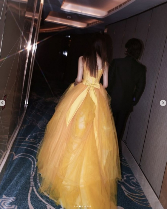그는 노란색 드레스를 입고, 턱시도 차림의 세븐과 다정하게 팔짱을 끼며 우아함을 뽐냈다.