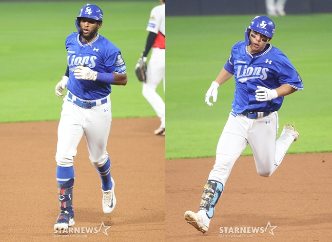 삼성 르윈 디아즈(왼쪽)과 김영웅이 28일 KIA와 KS 4차전 1회초 연타석 홈런을 터뜨리고 있다. /사진=김진경 대기자