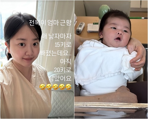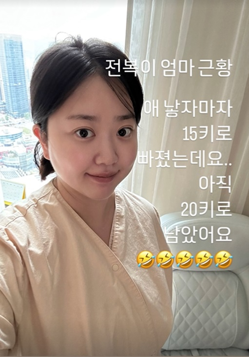 김다예는 29일 개인 계정에 "전복이 엄마 근황"이라며 "애 낳자마자 15kg 빠졌는데요, 아직 20kg 남았어요"라고 썼다.