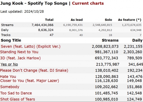 전 세계의 음악 차트 및 업데이트 소식을 실시간으로 다루는 '차트 데이터'(chart data)에 따르면, 정국의 'GOLDEN'에 수록된 모든 곡이 t스포티파이에서 각각 1억 스트리밍을 돌파하며 막강한 음반 파워와 인기를 입증했다.