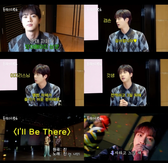 가장 먼저 공개된 콘텐츠는 '동네스타K4'. 진은 지난 29일 오후 6시 릴리스된 '동네스타K4'에서 재치 넘치는 입담과 함께 신곡 'I'll Be There' 무대를 최초 선보였다. 진이 나온 회차는 유튜브 인기 급상승 동영상 4위에 오르며 뜨거운 화제성을 입증했다.