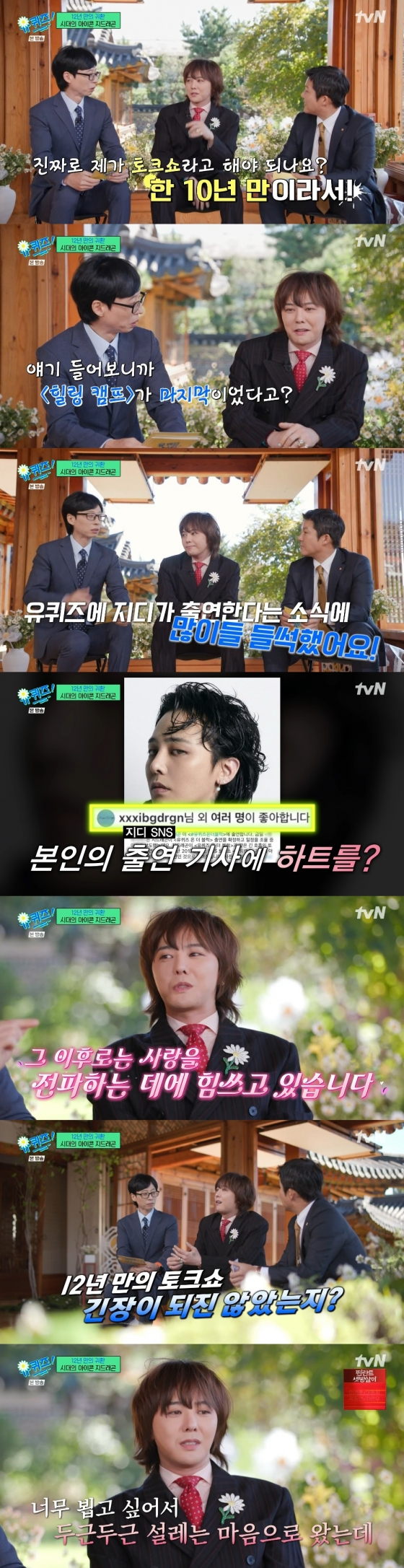 이날 지드래곤은 "이런 토크쇼 출연이 한 10년 만"이라면서 "사실 긴장이라기 보다는 너무 뵙고 싶었다. 오랜만이어서 설레는 마음으로 왔는데 차 내리자마자 굉장히 긴장을 시키시더라. 나도 왜 그런지 모르겠는데 콘셉트가 뭐가 있었나보다. 나도 잘 모르겠었다. 나는 인사를 드리려고 했는데 너무 다들 조용하셨다. 그래서 저 끝까지 나도 조심스럽게 왔다"라며 '유퀴즈' 출연 소감을 밝혔다.