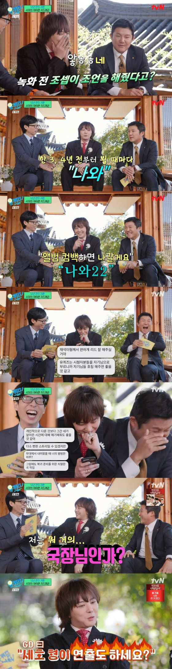 지드래곤은 '유퀴즈' 녹화 전 조세호에게 들은 조언도 언급했다. 그는 "한 3, 4년 전부터 뵐 때마다 '('유퀴즈'에) 나와'라고 했었다. 나도 나가고 싶었는데 아무 것도 없었다. '앨범 컴백하면 나가겠다'고 했었다. 또 다음에 만나면 '나와'라고 했다. 그러다가 진짜 나올 때가 돼서 '형 나가려고요'라고 했더니 챙겨주신다고 장문의 메시지를 보내줬다"라며 조세호가 보낸 메시지를 공개했다.