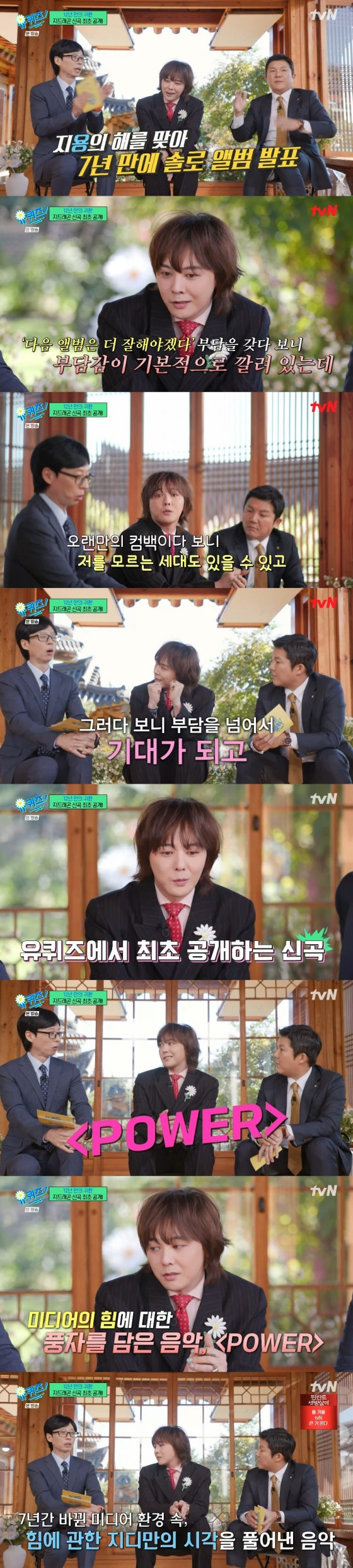 신곡 소개도 이어졌다. 지드래곤은 "'유퀴즈' 방송이 나갈 때쯤이면 공개가 됐을 것 같다. 오랜만에 나오는데 디지털 싱글이다. 제목은 'POWER'다. 힘에 관한 노래인데 상대적이지 않나. 근력도 있고 체력도 있고 여러가지가 있는데 나한테 힘은 음악이다. 내가 제3자로 7년의 공백기를 바라봤을 때 요즘 미디어의 힘이 크니까 미디어의 힘에 대한 풍자를 담은 음악이다. 중간 지점에서 다양한 힘을 잘 융화시키는, 여러가지 뜻을 담았다"라고 이야기했다.