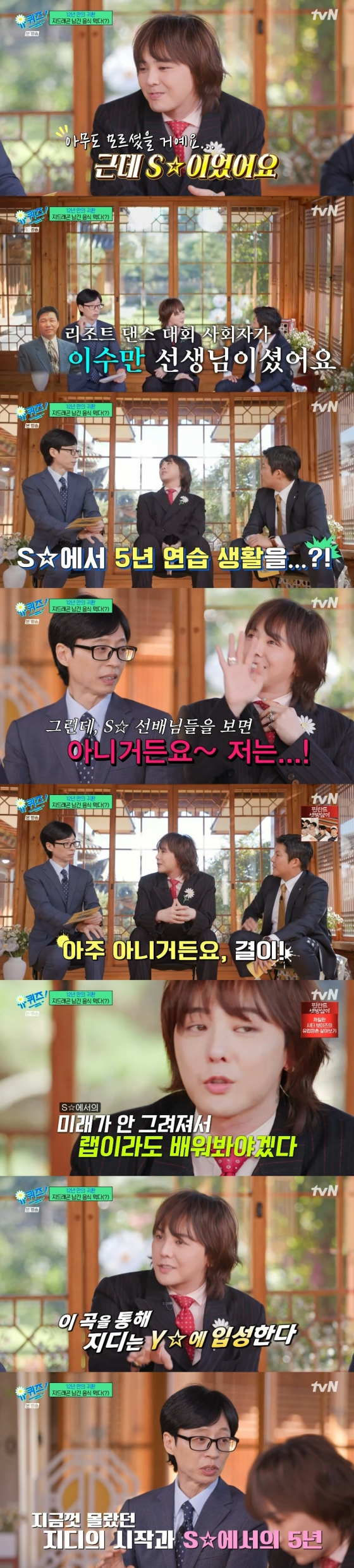 지드래곤은 SM엔터테인먼트(이하 SM)에서 연습생을 했었던 과거를 추억했다. 그는 "SM 연습생이었어요?"라는 유재석의 물음에 "아무도 모르셨을 거다. 근데 SM이었다"면서 "SM에 들어간 건 되게 우연한 기회였다. 가족들이랑 스키를 타러 리조트에 갔는데 그땐 춤 대회가 많았다. 우리 엄마가 항상 나를 내보냈었다. 요즘은 안 그러신다. 어느 순간부터 안 그러셨는데 그때 사회자가 이수만 선생님이었다. 정말 옛날이다. H.O.T.가 나오기 직전이었다"라고 대답했다.