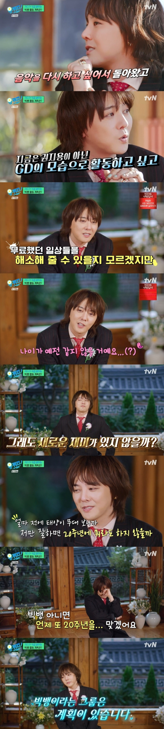 개인적인 계획은 솔로 컴백을 잘하는 것이라고. 지드래곤은 "가까운 시일 내에 컴백을 잘 하는 거다. 잘되고 말고가 아니라 컴백을 잘하고 싶다. 7년 만에 컴백인데 무료하던 일상들을 해소해 줄 수 있을지 모르겠지만 나이가 예전 같지 않을 거다. 그래도 새로운 재미가 있지 않을까 싶다"라고 이야기했다.