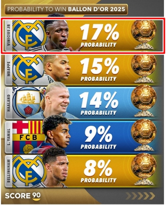 축구전문 스코어90은 30일(한국시간) 통계매체 북메이커의 자료를 빌려 2025년에 진행될 발롱도르 수상 확률을 소개했다. 비니시우스가 17%로 1위를 기록했다. 팀 동료이자 월드클래스 킬리안 음바페(레알)는 15%로 2위, 엘링 홀란은 14%로 3위에 이름을 올렸다. 아직 먼 이야기이지만, 올해 발롱도르를 놓친 아픔을 만회하고 자신감을 가질 수 있다.