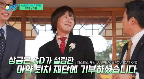 지난해 마약 투약 의혹으로 곤욕을 치렀던 가수 지드래곤(GD, 본명 권지용)이 자신이 설립한 마약 퇴치 재단에 '유퀴즈' 상금 전액을 기부했다.