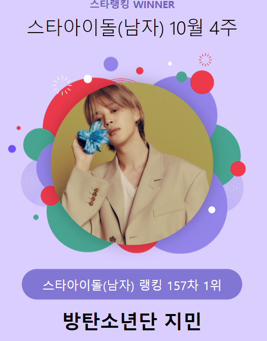 지민은 지난 24일 오후 3시 1분부터 31일 오후 3시까지 진행된 10월 4주(157차) 스타랭킹 스타아이돌 남자 랭킹 투표에서 3만8365표를 획득하고 정상을 지켰다.