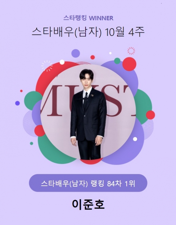 이준호는 지난 24일 오후 3시 1분부터 31일 오후 3시까지 진행된 10월 4주(84차) 스타랭킹 스타배우 남자 랭킹 투표에서 3만 710표를 차지하며 1위 자리에 올랐다.