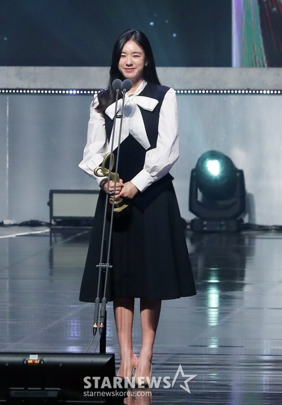 배우 안은진이 31일 오후 서울 중구 국립극장 해오름극장에서 진행된 '2024 대한민국 대중문화예술상'에서 문체부장관 표창을 수상한 뒤 소감을 말하고 있다.