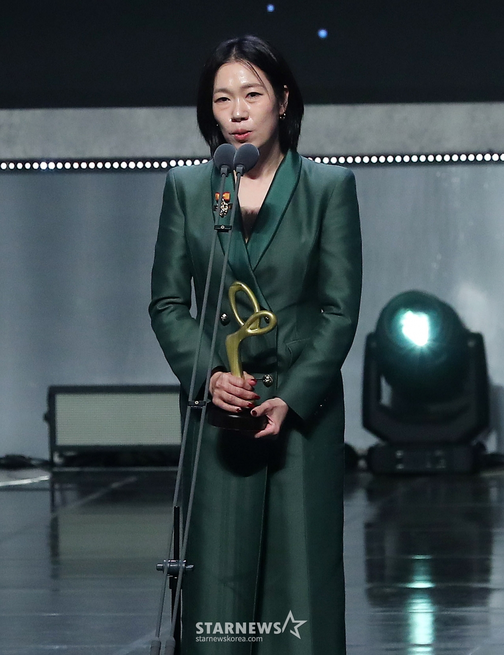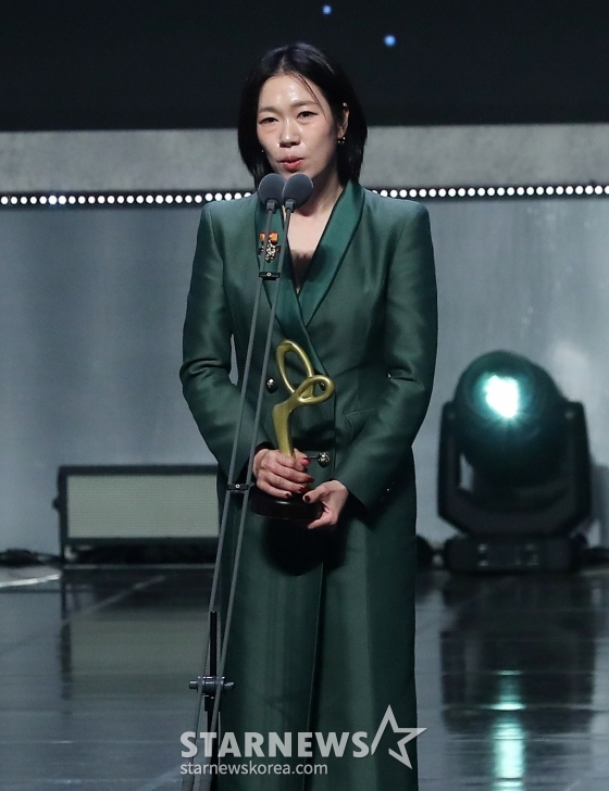 배우 염혜란이 31일 오후 서울 중구 국립극장 해오름극장에서 진행된 '2024 대한민국 대중문화예술상'에서 대통령 표창을 수훈한 뒤 소감을 말하고 있다.
