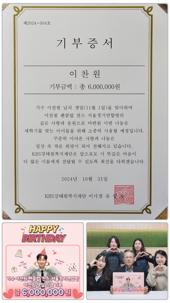 이찬원 팬클럽 찬스 서울경기연합방은 10월 31일 KBS강태원복지재단에 성금 600만 원을 전달했다.