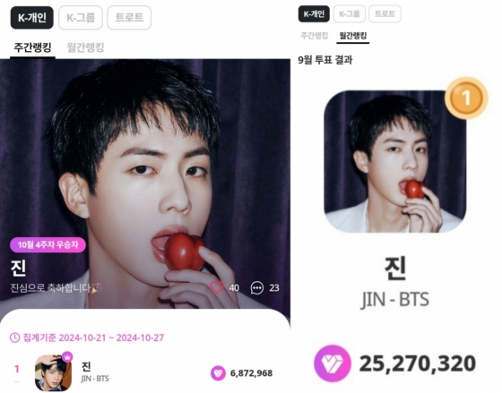 진은 마이원픽 'K-POP 개인부문 주간랭킹' 10월 4주차(10월 21일~10월 27일) 투표에서 687만 2968개의 하트를 얻어 1위에 올랐다.