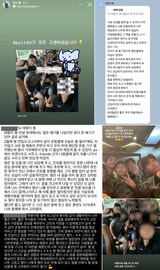 31일 뷔는 "Ebc1180기 모두 고생하셨습니다"라는 글과 함께 먼저 전역하는 선임의 제대를 축하하며 한 장의 사진을 공개했다.