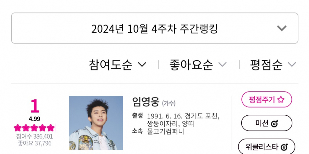 임영웅은 10월 4주차 아이돌차트 평점랭킹에서 38만 6401표를 얻어 1위를 차지했다.