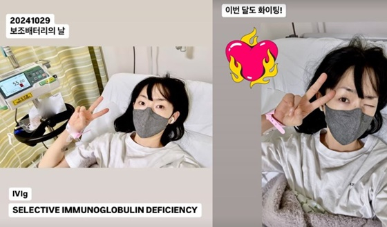 공개된 사진 속 김윤아는 마스크를 쓴 채 병원 침대에 누워 있다. 그는 'IVIG'이라는 글과 함께 면역주사 치료를 받고 있음을 알렸다.