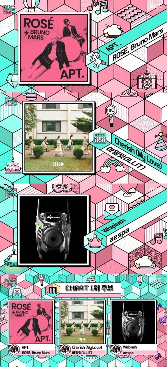 이날 1위 후보에는 로제, 브루노 마스 듀엣곡 '아파트(APT.)', 아일릿 '체리시(Cherish(My Love))', 에스파 '위플래시(Whiplash)'가 이름을 올렸다.