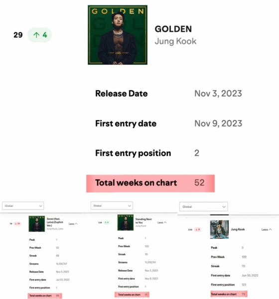 'Seven', 'Standing Next to You'도 해당 차트에 각각 68주, 51주 동안 장기 차트인하며 'GOLDEN'과 함께 강력한 음반, 음원 파워와 인기를 자랑했다.