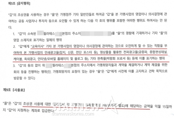 계약서 제 5조에는 가맹사업의 영업이나 의사 결정에 관여하는 것으로 오인하게 할 수 있는 직함을 양정원에게 부여해 인쇄광고물, 영상물을 활용한 전파광고물, 기타 판촉물 등에 표기하는 행위를 '금지 행위'로 규정하고 있다.