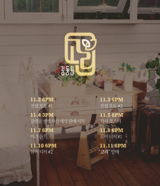 공개된 이미지에 따르면 정동원은 오는 11일 오후 6시 각종 음원 사이트를 통해 새 디지털 싱글 앨범 '고리'를 발매한다. 또한 컨셉포토를 시작으로 플랫폼 앨범 사전 예약 판매 시작, 가사 포스터, 미리듣기, 뮤비 티저 등 다양한 프로모션 콘텐츠의 일정을 공개해 기대를 모았다.