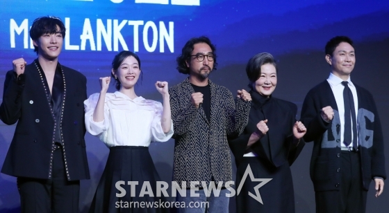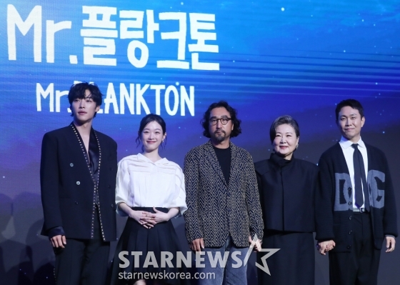 홍종찬 감독(가운데), 배우 우도환, 이유미, 김해숙, 오정세가 4일 오전 서울 마포구 호텔 나루 서울 엠갤러리에서 진행된 넷플릭스 드라마 'Mr.플랑크톤' 제작발표회에 참석해 포즈를 취하고 있다.