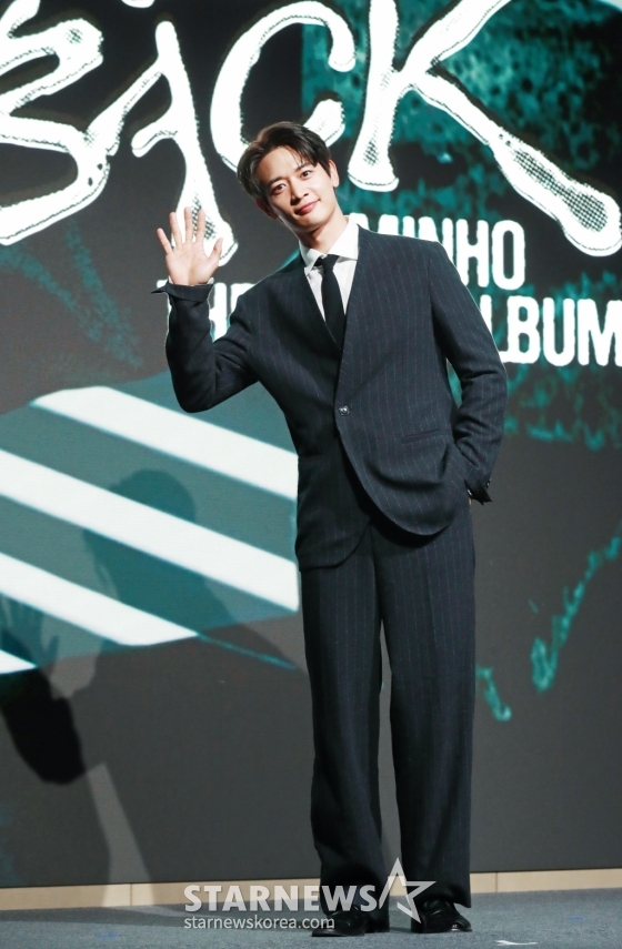 민호는 4일 오전 서울 영등포구 여의도동 페어몬트 앰배서더 서울 그랜드볼룸에서 첫 번째 정규앨범 '콜 백(CALL BACK)' 발매 기념 기자간담회를 개최했다. 진행은 민호와 절친 사이로 유명한 동방신기 최강창민이 맡았다.