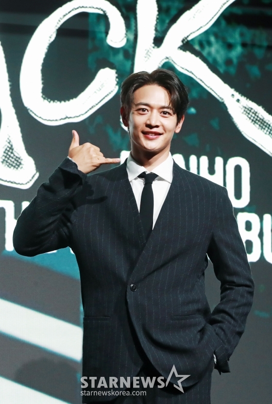 민호는 4일 오전 서울 영등포구 여의도동 페어몬트 앰배서더 서울 그랜드볼룸에서 첫 번째 정규앨범 '콜 백(CALL BACK)' 발매 기념 기자간담회를 개최했다. 진행은 민호와 절친 사이로 유명한 동방신기 최강창민이 맡았다.