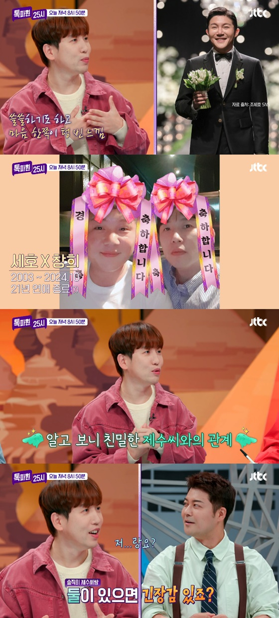 이날 MC 전현무는 남창희의 20년지기였던 조세호를 언급하며 "한때 사실혼 관계였던 조세호가 결혼했는데 기분이 어떠냐"고 물었다.